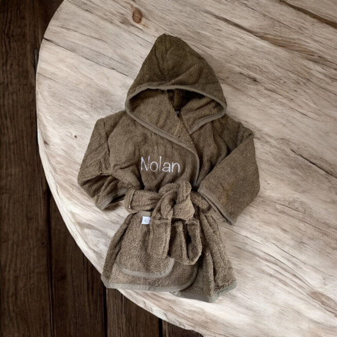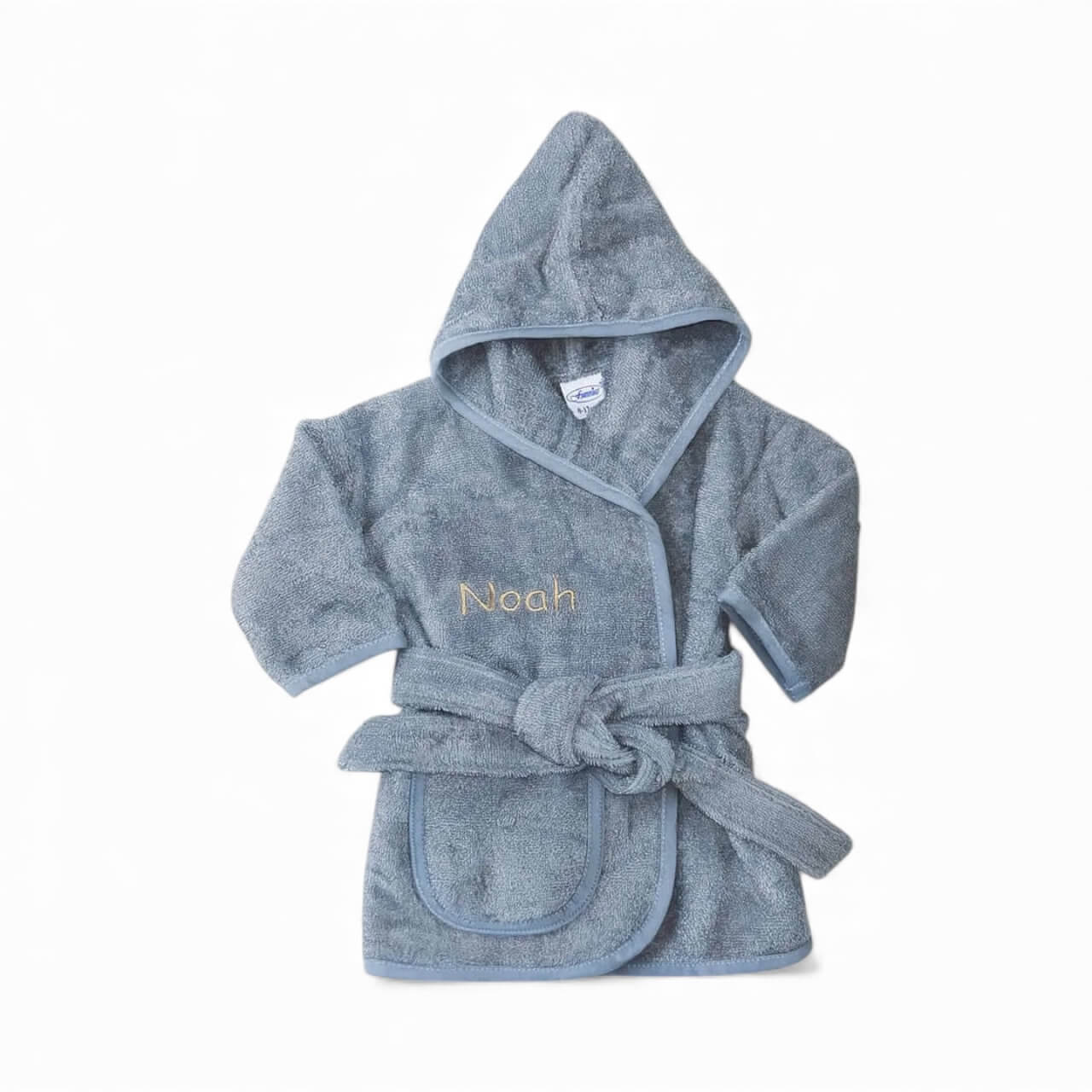 Zacht badjasje met naam voor een jongen. Verkrijgbaar in Blue, Grey en Sand. Ideaal als kraamcadeau en direct klaar om te geven. Vandaag besteld? Vandaag verzonden.