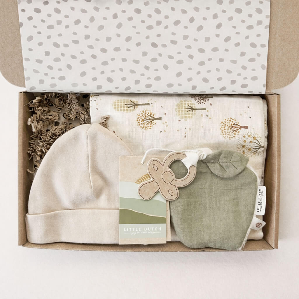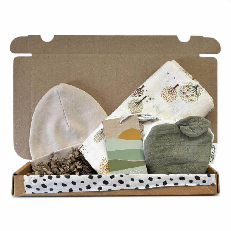 Een zacht en persoonlijk brievenbuscadeau voor een pasgeboren jongen. Brievenbuscadeau soft nature bevat een babymutsje met naam, hydrofiele spuugdoekjes en een speendoekje. Daardoor geef je een praktisch cadeau dat eenvoudig per post kan worden verstuurd.