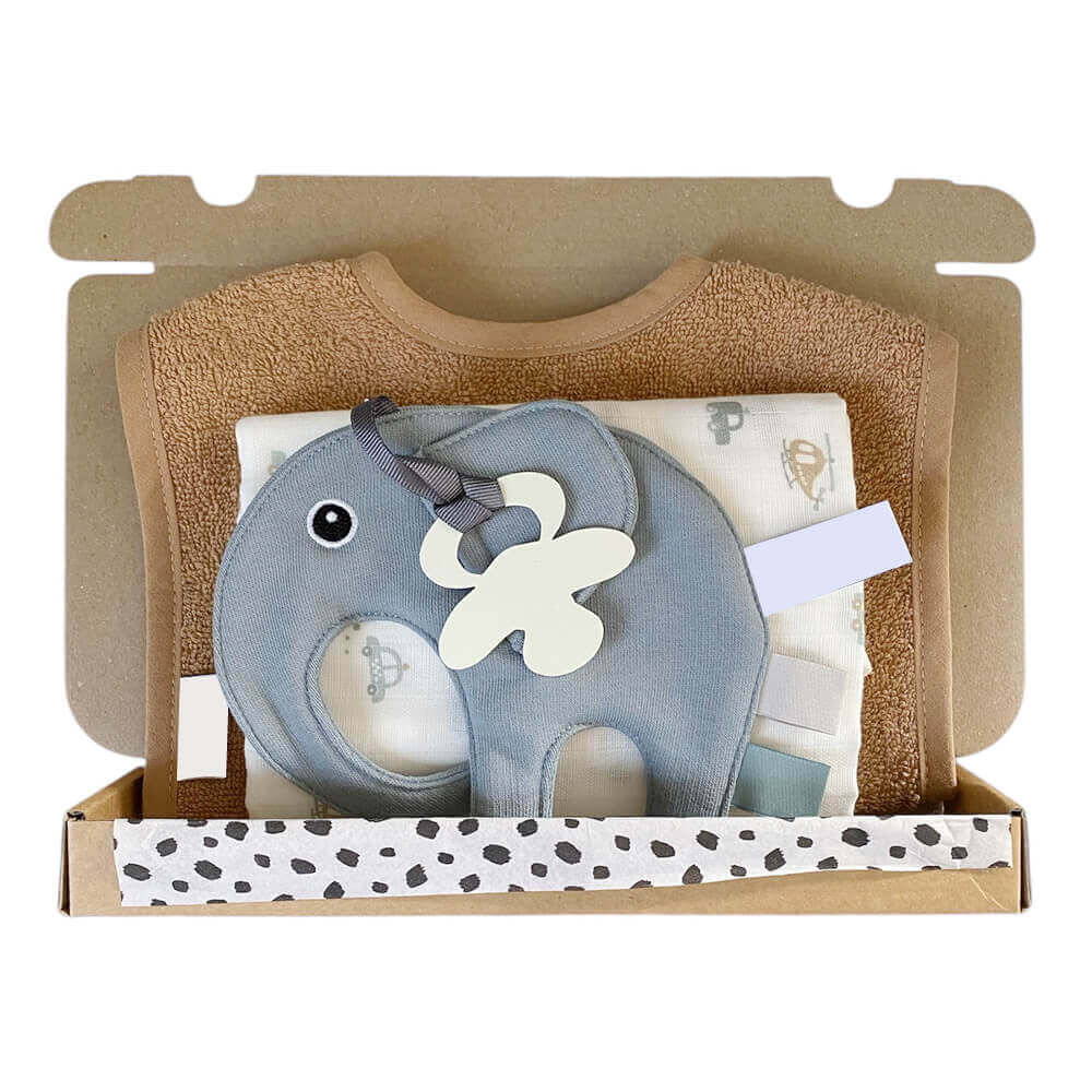 Brievenbuscadeau Jongen – Cream Blauw is een liefdevol samengesteld kraampakket dat stijl, comfort en gebruiksgemak combineert. Het bestaat uit drie onmisbare baby-items die zorgen voor schone hapjes, zachte knuffelmomenten en dagelijkse verzorging.