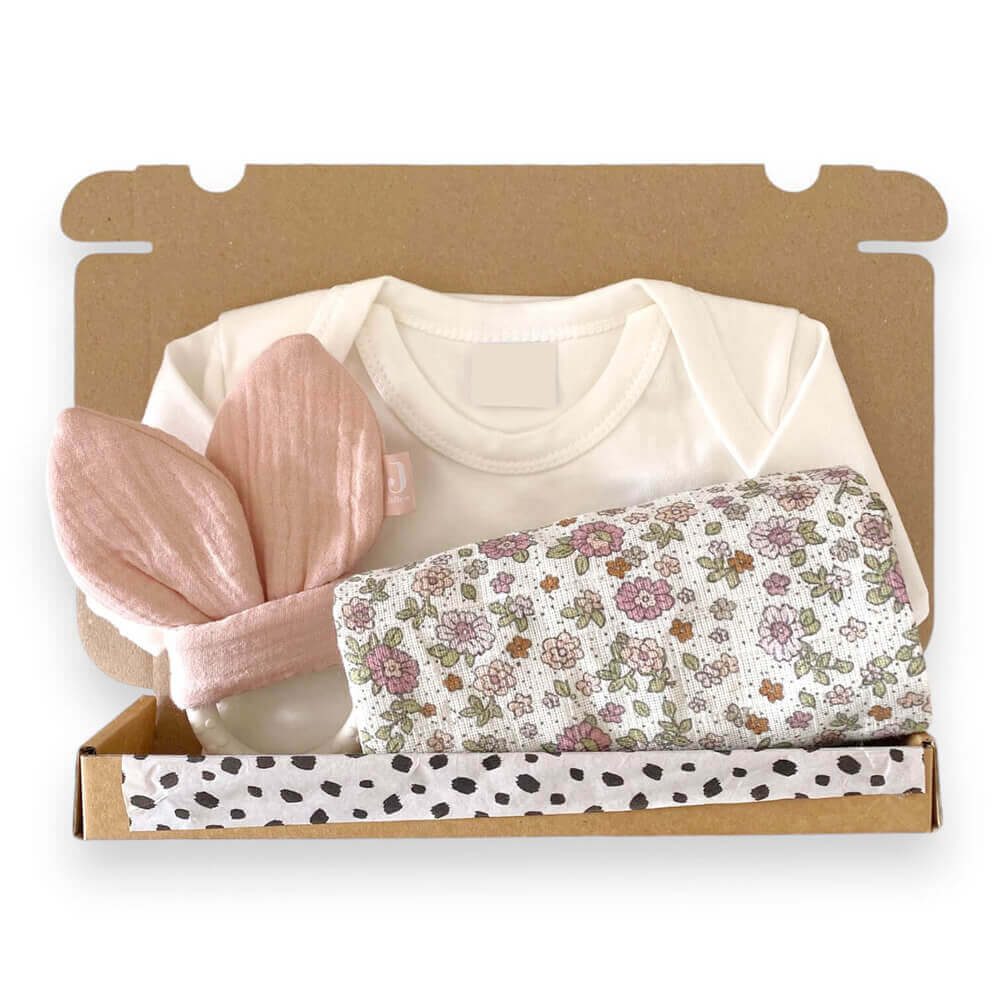 Dit brievenbuscadeau meisje is een zachte en stijlvolle verrassing voor kersverse ouders. De combinatie van een ecru rompertje, een lieve bijtring met konijnenoortjes en een bloemenprint hydrofiele doek zorgt voor een warm en verzorgd geheel. Een mooi cadeau voor wie een klein, praktisch en persoonlijk gebaar wil geven.