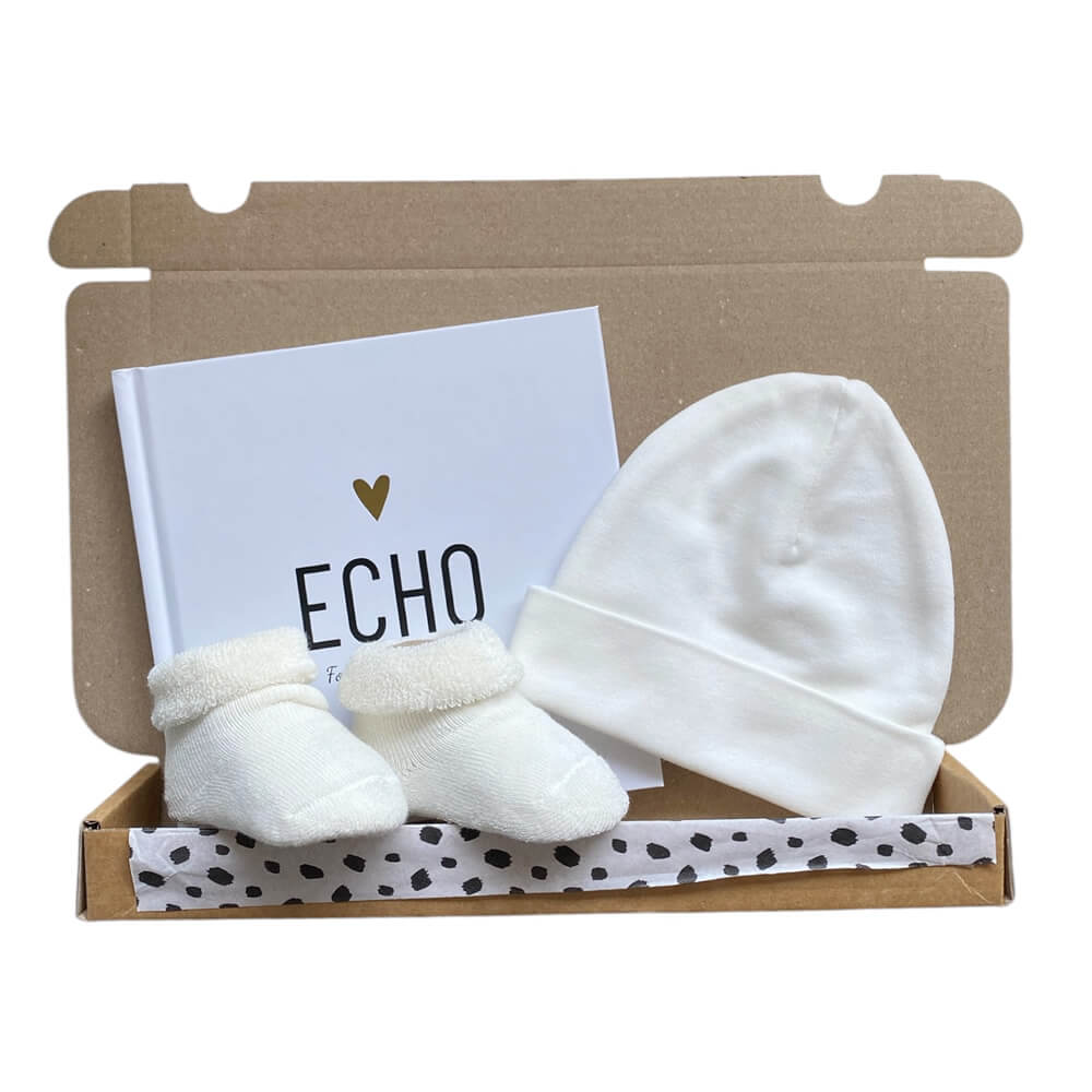 Een echo invulboekje van Lifestyle2Love, een ecru babymutsje en een paar ecru sokjes.