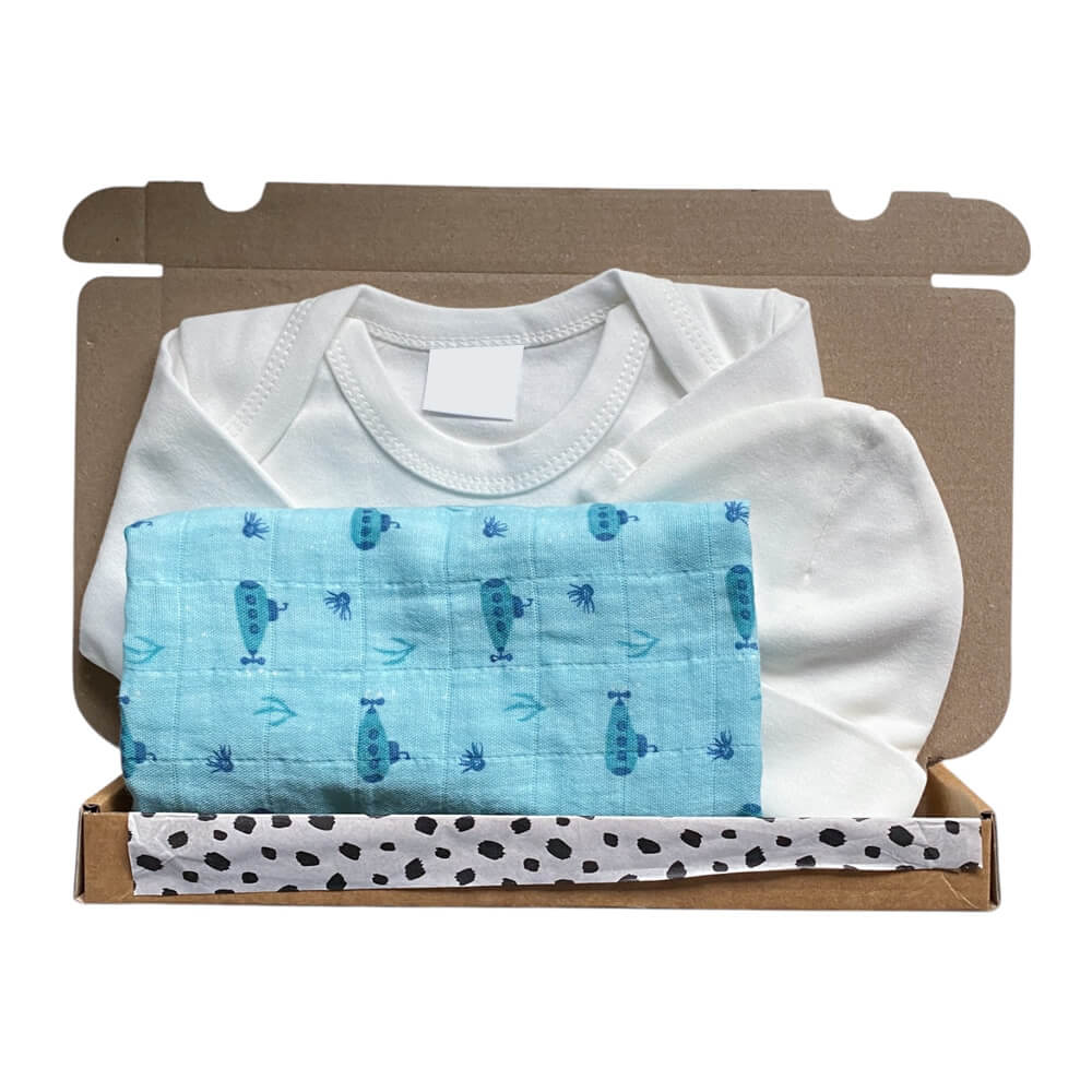 Brievenbuscadeau Jongen – Fresk Submarine is een stijlvol en praktisch cadeautje. Met Fresk swaddle (Submarine), ecru rompertje en zacht mutsje. Liefdevol verpakt en direct verzonden.