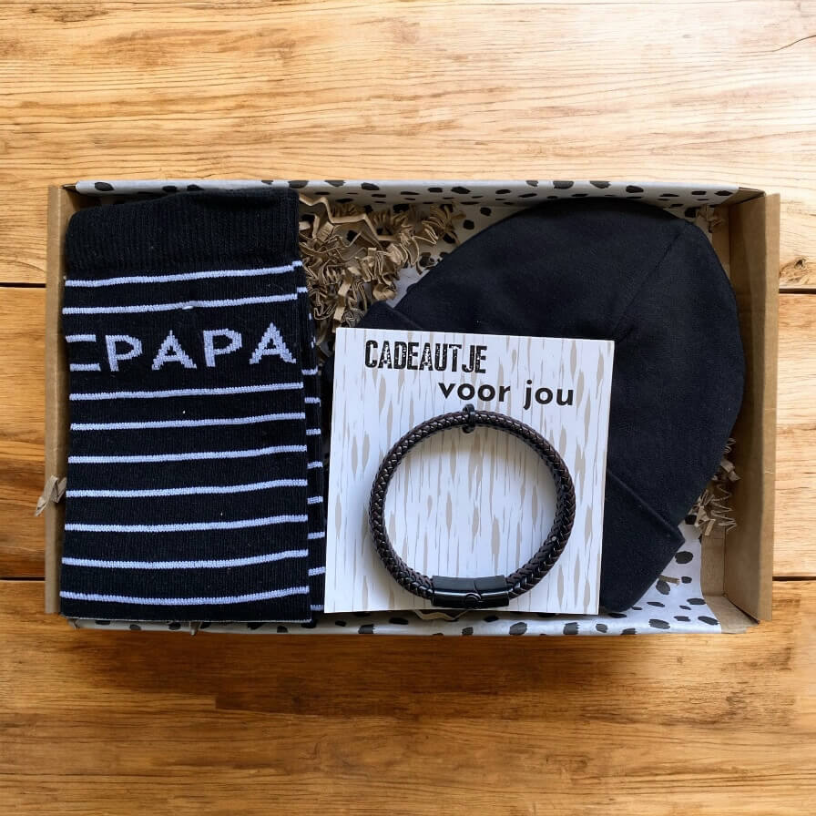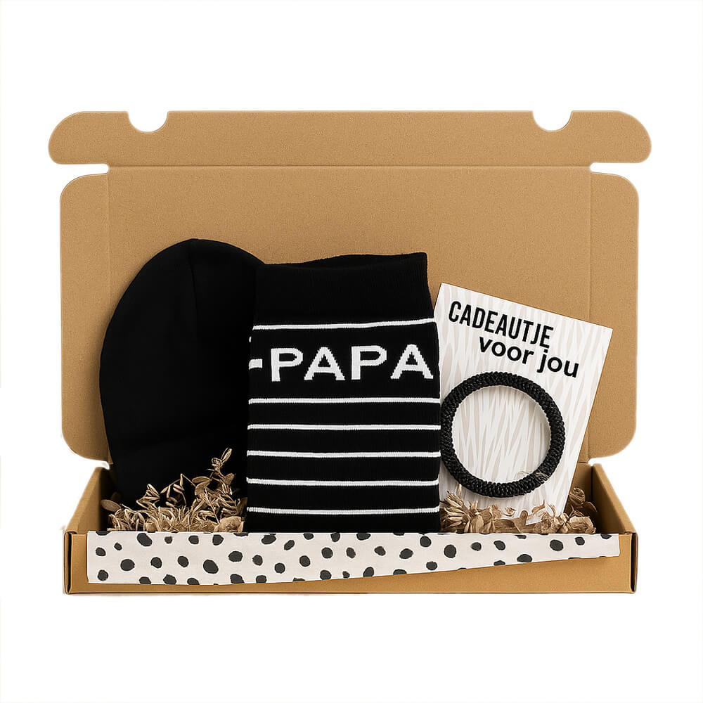 - Sokken PAPA (maat 43/46): Comfortabele, stoere sokken die perfect zijn om de nieuwe rol van papa in stijl te vieren. Ideaal voor dagelijks gebruik, maar vooral om hem te laten zien hoe speciaal hij is. Let op: de sokken op de afbeelding zijn helaas niet meer beschikbaar. In plaats daarvan ontvang je de ‘papa sokken’ zoals hieronder weergegeven.