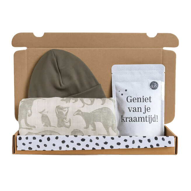 Hoera, je gaat met verlof! Geef de aanstaande moeder een moment van pure ontspanning met ons Cadeau Geniet van je Kraamtijd Olijf. Dit zorgvuldig samengestelde verwenpakket biedt zowel ontspanning voor de moeder als praktische items voor de baby, perfect voor deze bijzondere tijd.