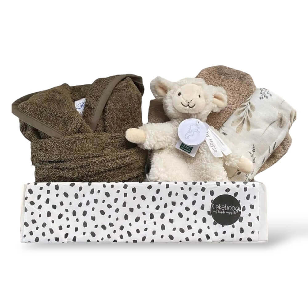 Verwen kersverse ouders met deze cadeaubox: een zacht babybadjasje in Forest, knuffel Lamb Leo, douchehandschoen en een hydrofieldoek. Een stijlvol en praktisch cadeau dat comfort en geborgenheid biedt. Maak het extra persoonlijk met naam.