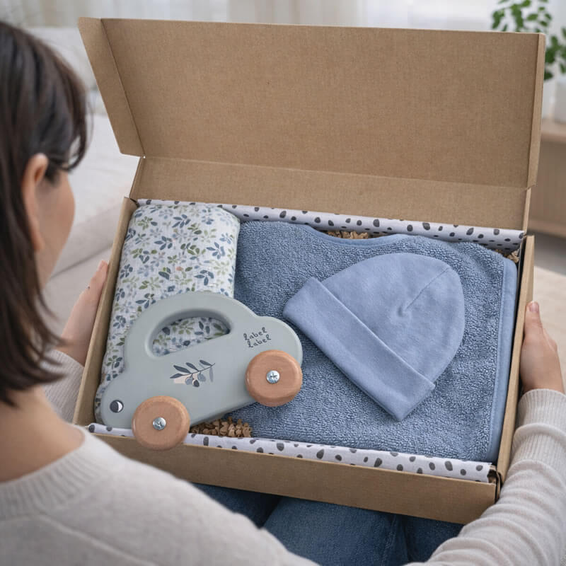 De items in deze cadeaubox zijn zorgvuldig gekozen voor de eerste periode. Van knoeimomentjes en verzorging tot ontdekken en spelen, alles sluit goed aan op het ritme van een pasgeboren baby.