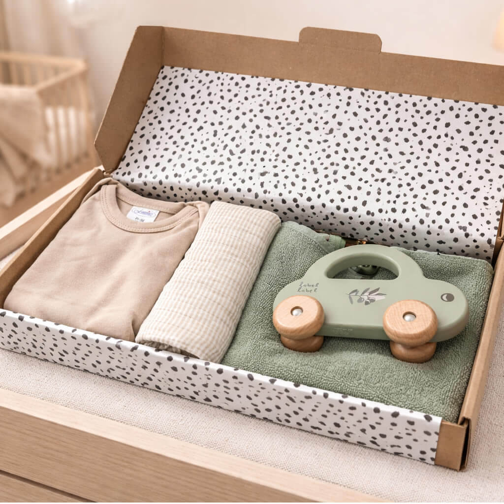 Deze cadeaubox bevat praktische items die dagelijks gebruikt worden, aangevuld met een houten auto die uitnodigt tot de eerste speelmomentjes. Zo geef je niet alleen iets moois, maar ook iets waar de baby echt plezier van heeft.