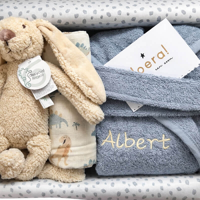 Extra bijzonder is dat je het badjasje kunt laten borduren en het knuffeldoekje kunt laten bedrukken met naam. Zo geef je een uniek en persoonlijk cadeau dat speciaal voor dit kindje is gemaakt en een blijvende herinnering vormt.