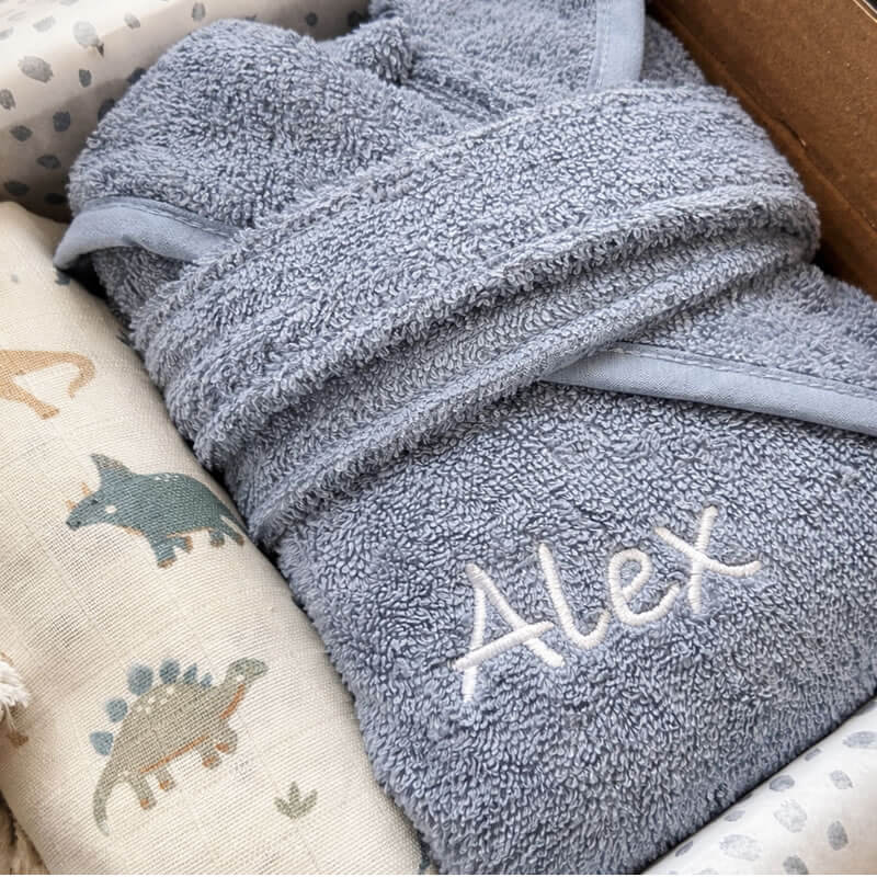 - Badjasje Grey Blue (0–12 maanden) – heerlijk zacht na het badje en te borduren met naam voor een persoonlijke touch