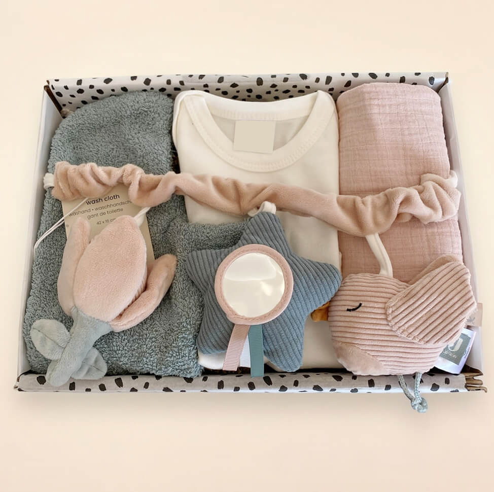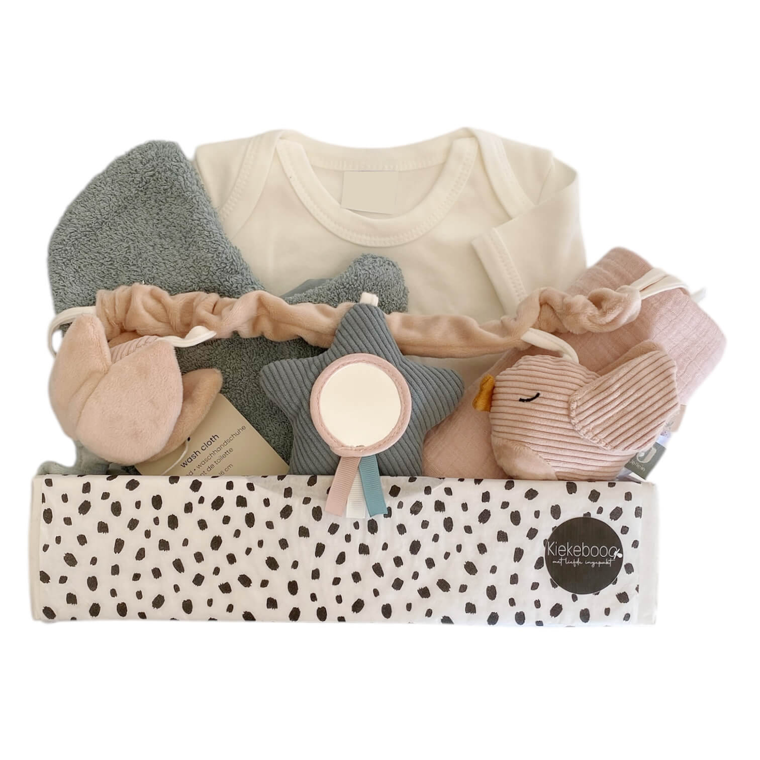 Op zoek naar een origineel geboortecadeau voor een meisje? Met dit complete pakket van Kiekebooo geef je niet alleen iets moois, maar vooral iets bruikbaars. De combinatie van zachte basics en een vrolijke Jollein wagenspanner maakt dit geschenk ideaal om direct te gebruiken bij de verzorging en onderweg.