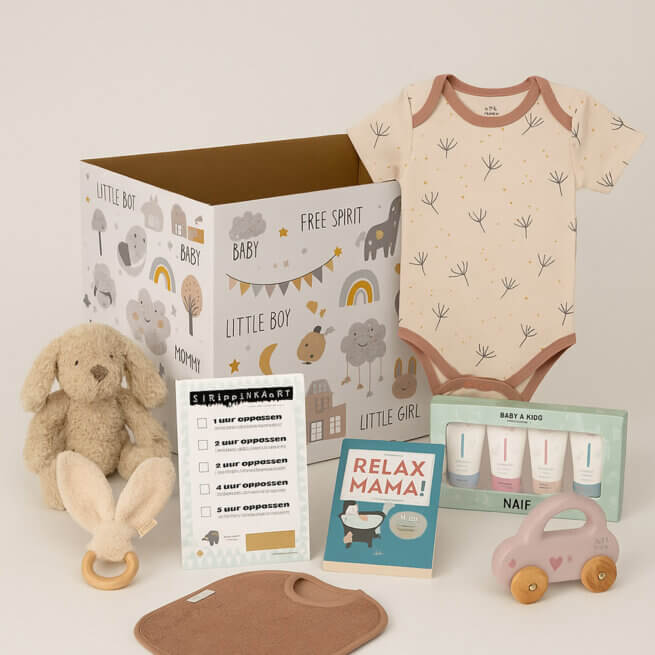 Een mix van cadeaus voor baby én ouders. Denk aan rompers, sokjes, knuffel, hydrofiele doeken of een badcape. Vaak zit er iets persoonlijks bij, zoals een slab met naam.