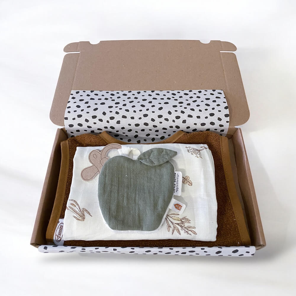 De combinatie van zacht textiel, veilige materialen en neutrale kleuren maakt dit pakket tot een veelzijdig cadeau. De tinten olijfgroen, klei en wit passen bij elke babykamerstijl en zijn tijdloos mooi. Alle producten zijn geschikt vanaf de geboorte en vriendelijk voor de gevoelige babyhuid.