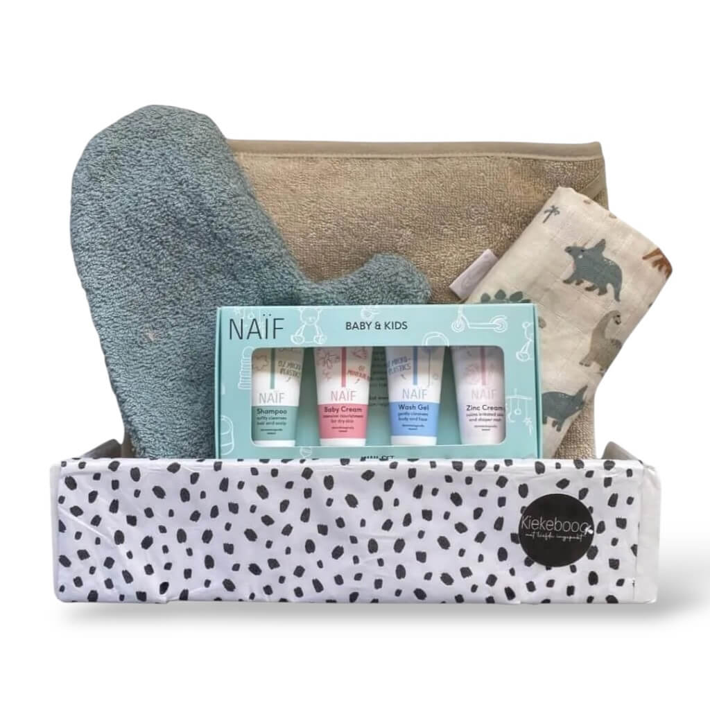 Complete verzorgingsset voor jongens met badcape, hydrofieldoek, washand en Naïf miniverzorging. Zacht, praktisch en luxe verpakt. Voor 15:00 besteld = vandaag verzonden.