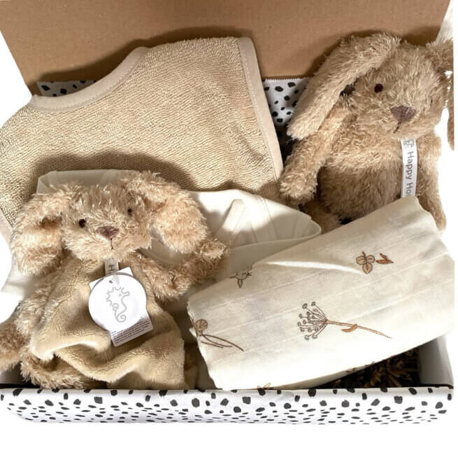 Begin met het kiezen van een zachte knuffel die direct een glimlach op het gezicht van de baby en ouders tovert. Denk aan het bekende knuffelkonijn van Happy Horse of een andere lieve knuffel die perfect past bij de babyuitzet. Voeg vervolgens een hydrofiele doek, speendoekje of slab toe om het cadeau compleet te maken. Ook handig: de hydrofiele doek is ideaal voor onderweg of als multifunctioneel doekje thuis.