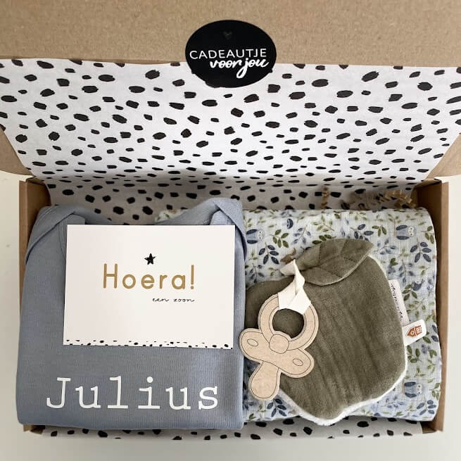 Dit Little Dutch kraamcadeau voor jongens is liefdevol samengesteld en stijlvol verpakt. Het cadeau past door de brievenbus en wordt zonder factuur verzonden, maar mét mogelijkheid voor een persoonlijke felicitatie.