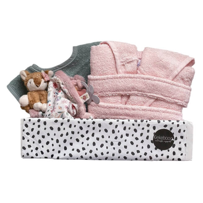 Centraal in deze box staat het knuffeldoekje met hertenprint in roze tinten. Een sfeervolle, bosrijke print die meteen uitnodigt tot knuffelen. Het badjasje in blushkleur (maat 0–12 maanden) is heerlijk zacht en houdt kleintjes warm na een badje. De badstof slab in stone green maakt het geheel compleet en zorgt voor extra gemak bij de eerste hapjes of knuffelmomenten.