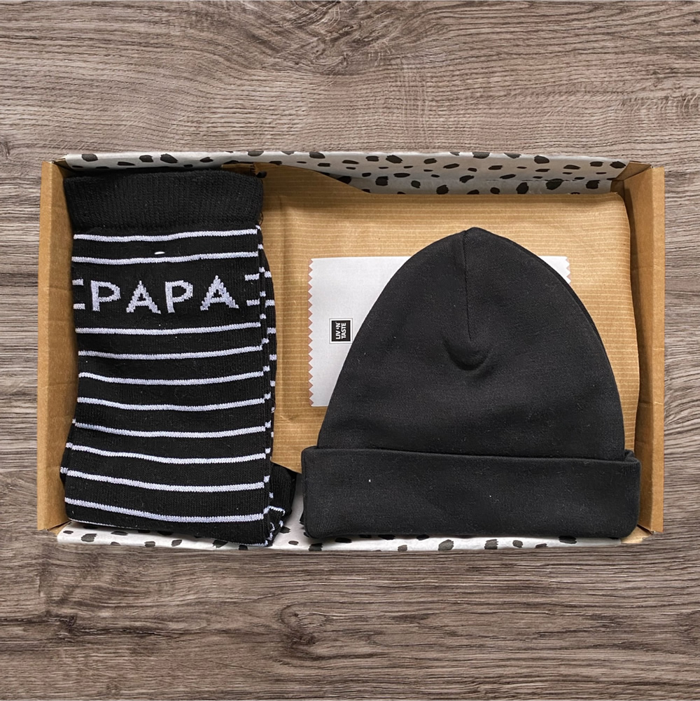 Let op! De sokken op de afbeelding zijn niet meer leverbaar. In plaats daarvan komen de papa sokken in de afbeelding hieronder. - Babymutsje zwart